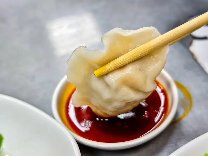 招牌的蝦仁水餃採用純手工擀製的麵皮,吃起來具備一定的厚度與存在感,咀嚼時散發出純粹的麵香且毫不軟爛。飽滿的內餡完美融合了鮮甜的韭黃與扎實的豬絞肉,並豪邁地包入一整隻完整蝦仁。一口咬下,三種截然不同的食材在口中同時綻放,交織出豐富且契合的絕妙口感。無論是單吃品嚐原味,或是沾取些許醬油提鮮,皆有著令人不自覺想一再回訪的樸實美味。