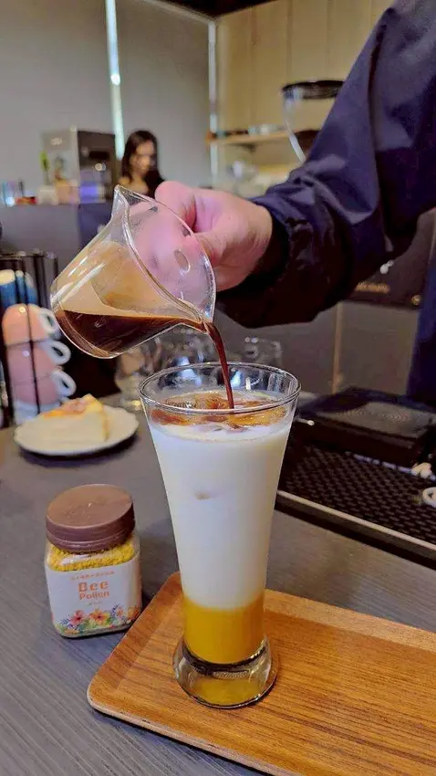 攪拌均勻後,口感細膩滑順,奶香、蜂蜜香與咖啡的醇厚融合得恰到好處。最特別的是,花粉的味道帶點像南瓜的自然風味,微微清甜又溫潤,尾韻還會留下一絲花香。每一口都柔滑溫暖,慢慢在嘴裡散開,讓人忍不住一口接一口。