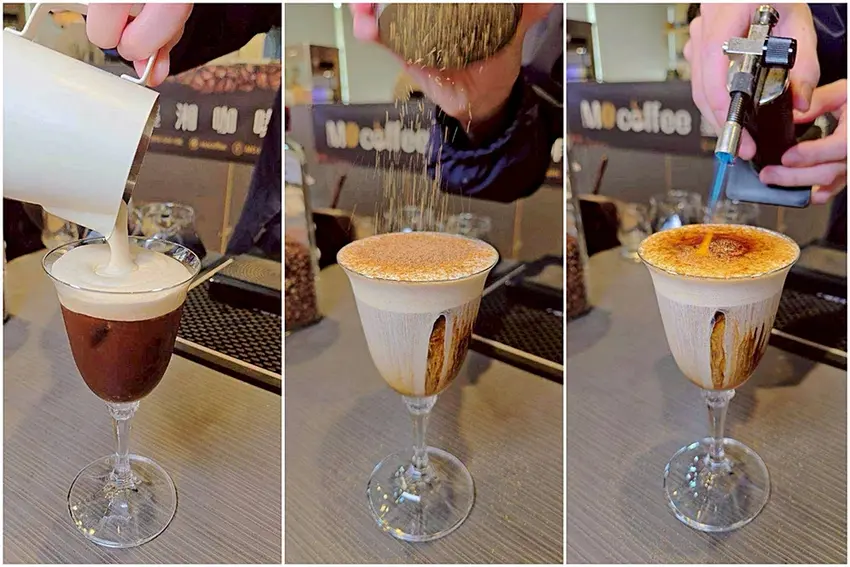如果你是視覺系飲品控,墨湘咖啡的 黑糖炙燒蜜絕對讓你驚喜!這杯飲料分成三層,每一口都能感受到不同的風味:最底層是濃郁冰滴咖啡,帶著咖啡的深厚香氣;中間鋪上細緻奶蓋,柔滑順口;最上層則撒上滿滿黑糖,現場還會用炙燒的方式,香氣瞬間飄散,視覺與味覺雙重享受。