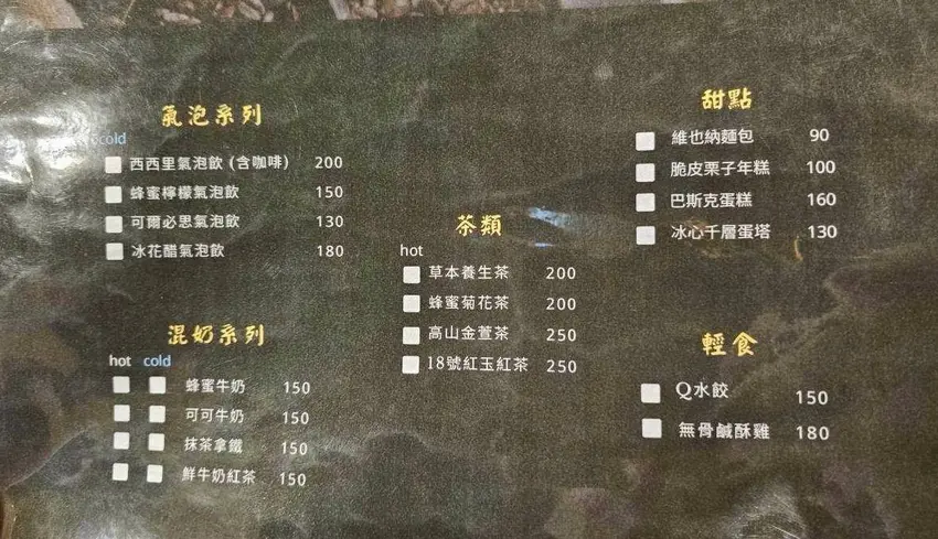 不喝咖啡或是隨著心情變化來點不一樣的飲料,這邊也有氣泡系列、混奶或茶類唷!再甜點部分也有提供巴斯克蛋糕、維也納麵包等,輕食類則是有水餃、無骨鹹酥雞。