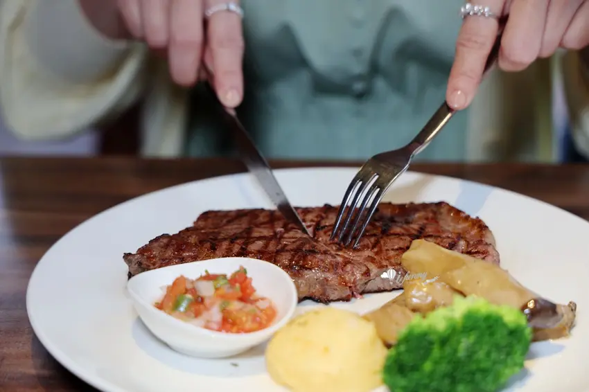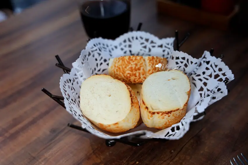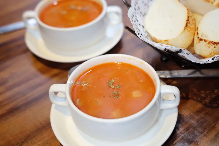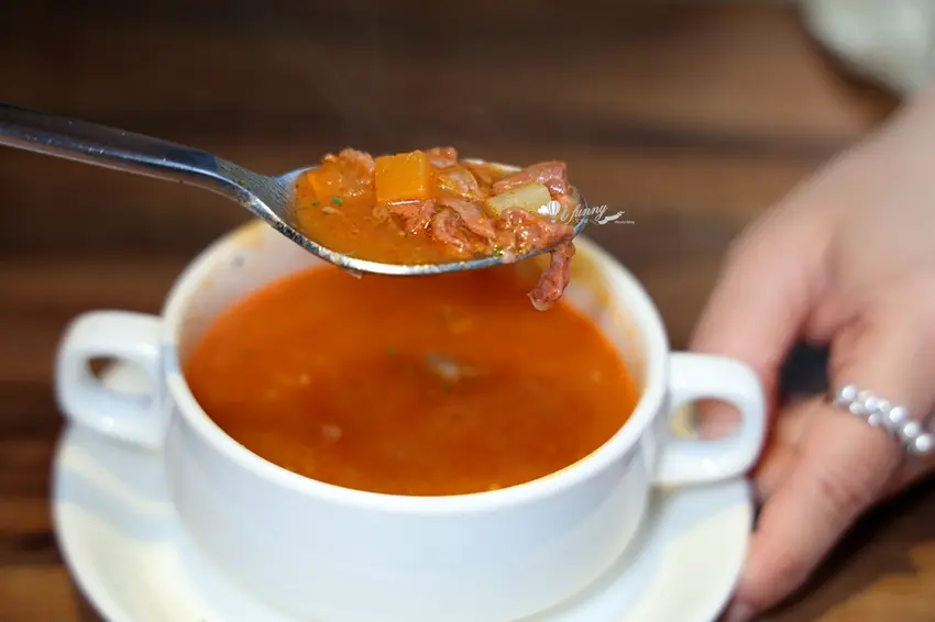店內的點餐方式極具彈性,只需加價 115 元即可將單點牛排升級為套餐,享有起司麵包、主廚湯品、無限暢飲的冷飲吧與餐後甜點。其中熱騰騰上桌的「起司麵包」表現亮眼,外皮微焦帶脆,內層則宛如雲朵般綿密有彈性。搭配以大量番茄、洋蔥等蔬菜慢火熬煮的主廚羅宋湯,湯頭醇厚鮮甜且回甘。羅宋湯內更豪邁地加入了長時間燉煮至極度軟嫩的牛排邊肉,將起司麵包沾取濃湯一同享用,鹹香起司與濃郁精華在口中交織,滿足感極高。