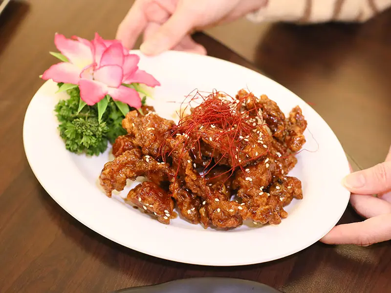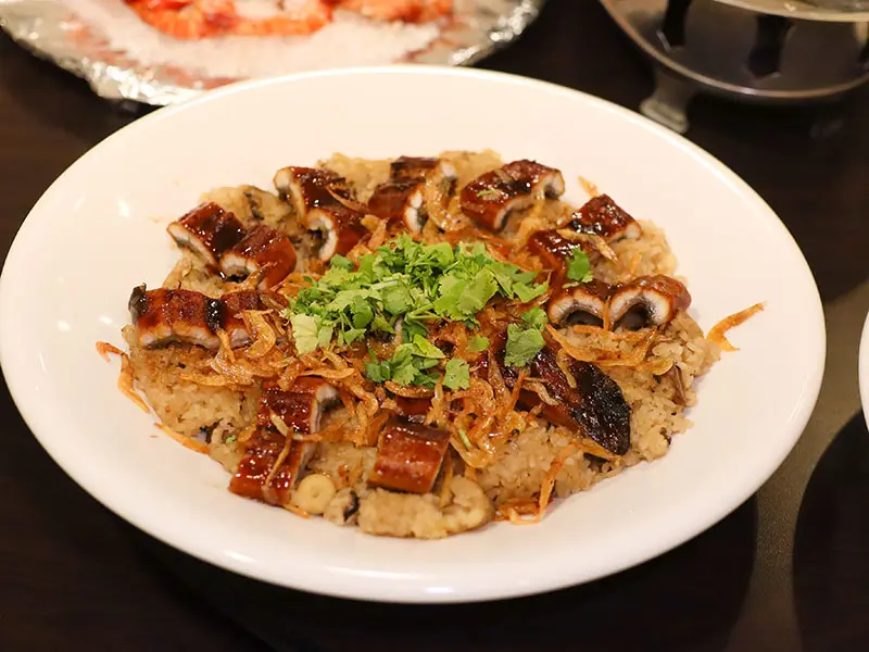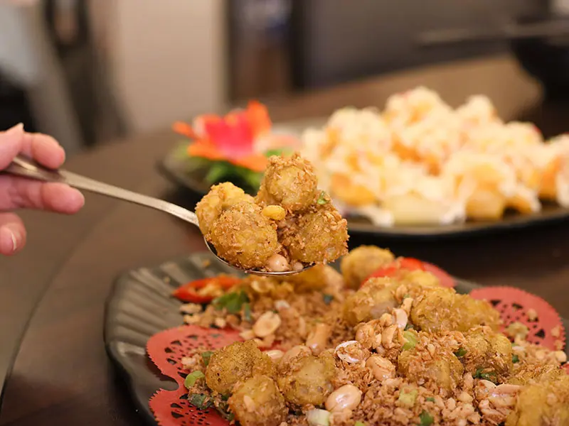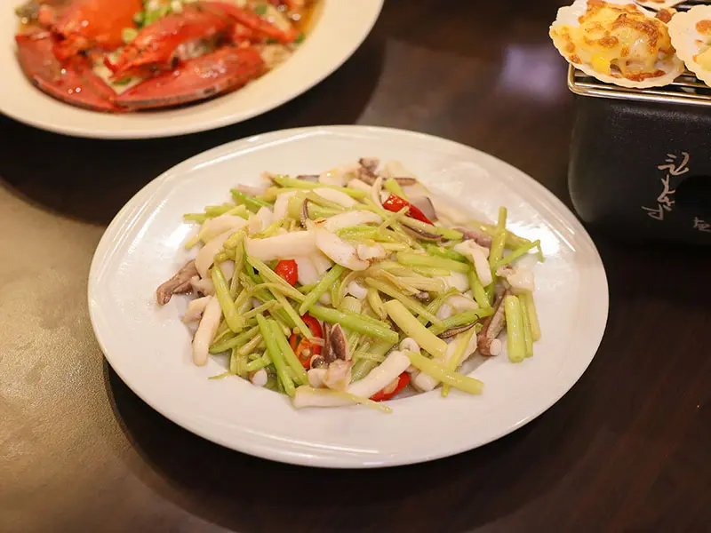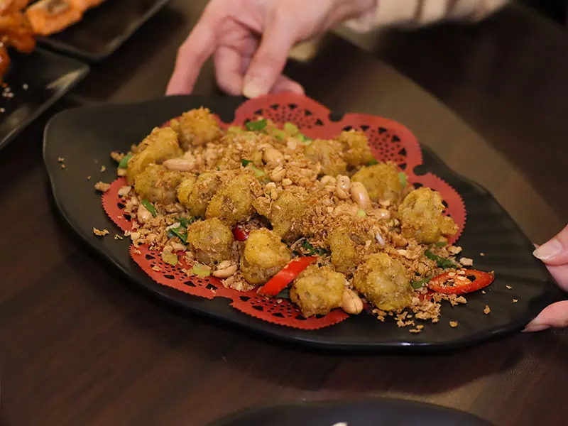 若想搭配飲品,定價 220 元的「炒黑螺肉」絕對是首選。螺肉處理得乾淨無腥味,口感 Q 彈爽脆,略帶鹹香的重口味調味,讓海味隨著咀嚼逐漸釋放,極度下酒。同樣定價 220 元的「梅汁排骨」則在外層炸至微酥,內裡肉質扎實,部分更帶有脆口的軟骨,搭配清爽解膩的酸甜梅汁,令人食指大動。此外,外酥內 Q 且帶有蒜香與堅果香氣的「椒鹽龍珠」(280 元),以及經典清爽的「鳳梨蝦球」(320 元),皆是極具水準的熱炒佳作。
