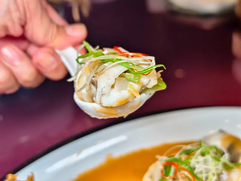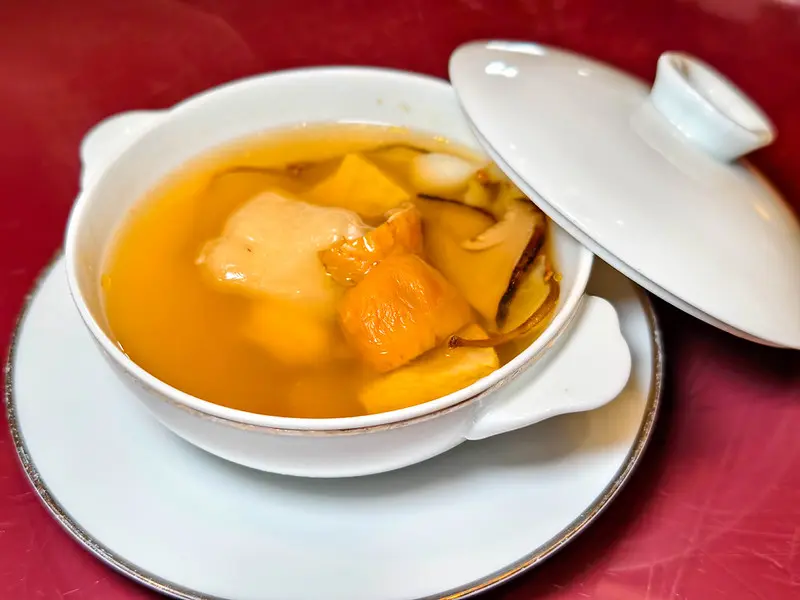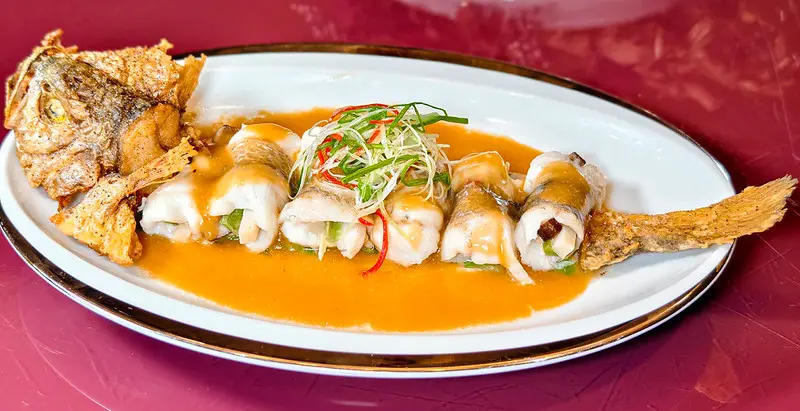 海鮮料理同樣精彩。「菠蘿極汁蝦滑蓮藕餅」將草蝦與白蝦打成細緻蓬鬆的蝦膠,鋪於雲林蓮藕片上煎至兩面金黃酥脆。底層搭配以屏東金鑽鳳梨慢熬的港式極汁,蝦膠的軟嫩與蓮藕的脆爽形成豐富對比,酸甜明亮的鳳梨醬汁更讓整體風味清爽解膩。展現精細刀工的「南乳豆醬黃花魚捲」,需先將多刺的小黃魚細心去刺取肉,包入春筍與貢菜後捲起,再佐以自家製的南乳豆醬。細緻無土腥味的魚肉與爽脆的蔬菜層次分明,豆醬香氣濃郁卻不掩蓋魚肉本身的鮮甜,盡顯傳統廣式料理的深厚底蘊。