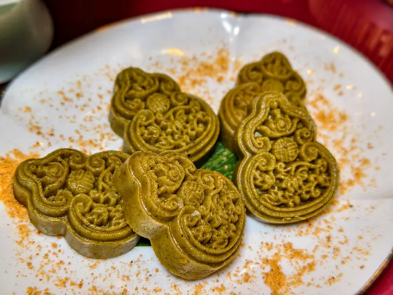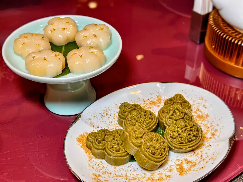 主菜「白蘆鮮筍牛仔粒」以主廚自製的香椿醬作為靈魂,搭配春季限定的鮮甜白蘆筍與無骨牛仔粒大火爆炒。極佳的鑊氣不僅逼出了和牛的脂香與蔬菜的清甜,更完美保留了白蘆筍的細緻纖維與邊緣的迷人焦香。餐後甜點同樣融入了台灣在地元素,造型精緻的「擂茶貢糖糕」將客家擂茶的細膩茶香與花生貢糖的堅果氣息巧妙結合,口感綿密且甜度適中。最後以「杏汁桂花百合糕」唯美收尾,細磨的杏仁糕皮包裹著港式奶黃餡與日本百合,頂端點綴南港在地桂花,淡雅的花香與柔潤的質地,為這場春日饗宴畫下和緩且優雅的句點。