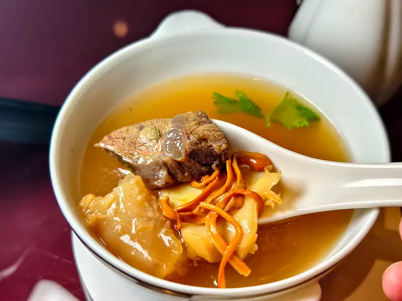 台北老爺Le Café中華料理吃到飽,現沖牛肉湯、鮭魚生魚片必吃。