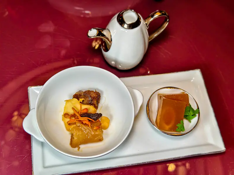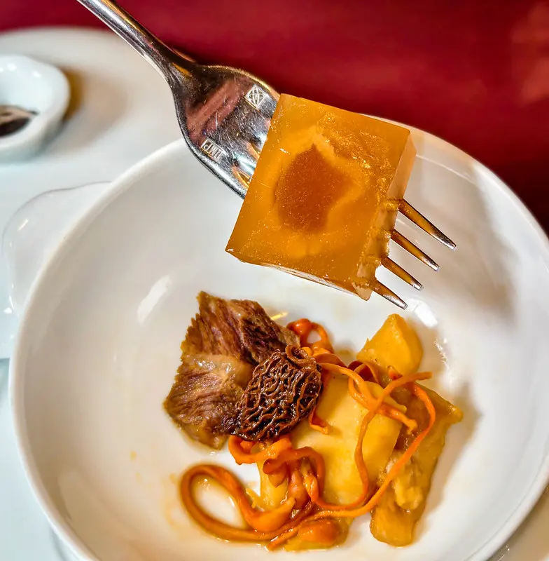 春饗季的湯品展現了極致的煲湯功夫。「蟲草枇杷燉花膠」以豬龍骨、雞腳與赤肉慢煲 6 小時為基底,再加入南投埔里枇杷乾、松阪豬與厚實花膠入甕蒸燉 1 小時。湯頭呈現透亮的琥珀色澤,枇杷的清甜巧妙融入其中,搭配花膠的溫潤膠質與厚切松阪豬的鮮嫩肉汁,滋味清爽不黏膩。「鮑潤牛湯琥珀凍」則是極具設計感的創意之作。主廚將牛大骨、和牛臉頰與十多種時蔬慢熬 10 小時的濃湯注入鮑魚中冷凝成凍。上桌時先品嚐冷凝狀態下濃縮的鮮鹹海味;接著淋入熱湯,讓膠質凍體瞬間化開,濃厚溫潤的牛肉鮮味隨之綻放,巧妙完成一湯兩吃的絕妙體驗。