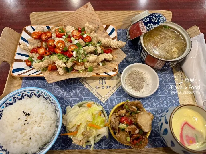 茶自點使用溯源食材,讓人感到安心。椒鹽豬里肌向來是我們一家三口的最愛,套餐裡除了主菜,皆含三樣小菜及例湯,其中的茶碗蒸更是眾所期待,又滑又嫩又飽水,口感似芙蓉豆腐,超美味~而小菜及例湯內容不定期會更換,口感味道都令人滿意!