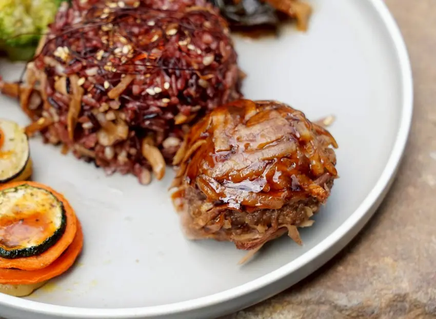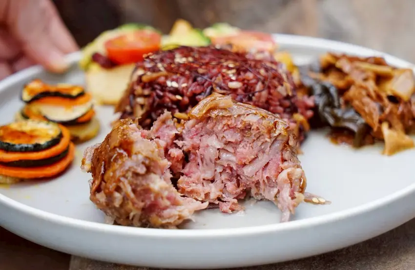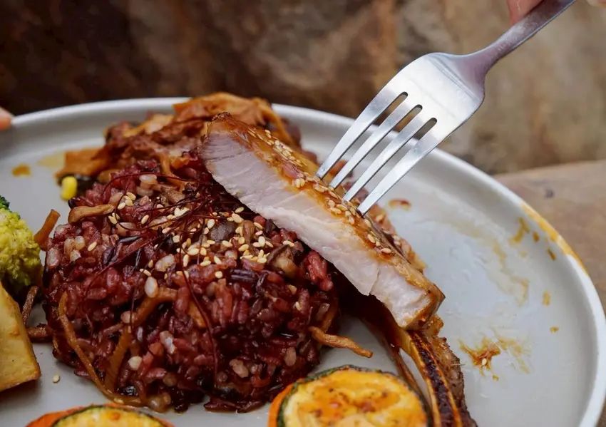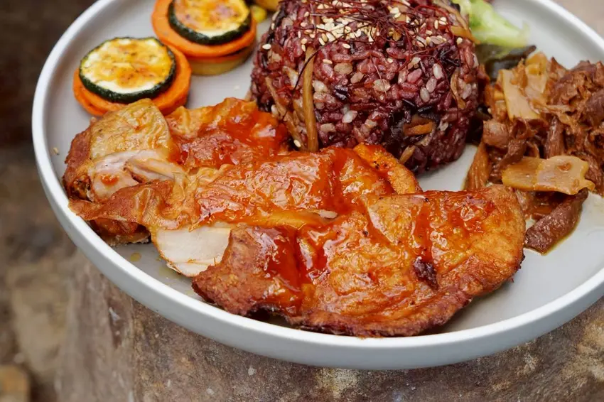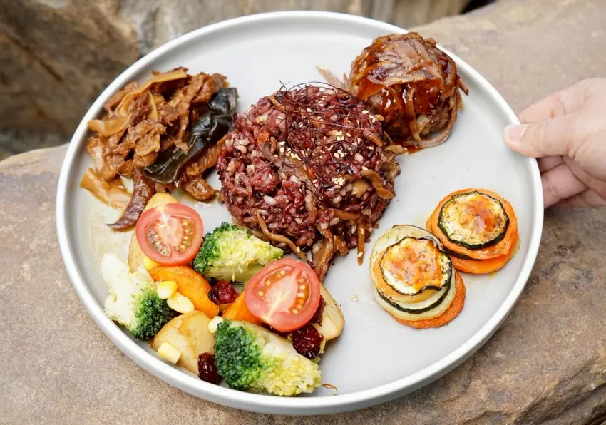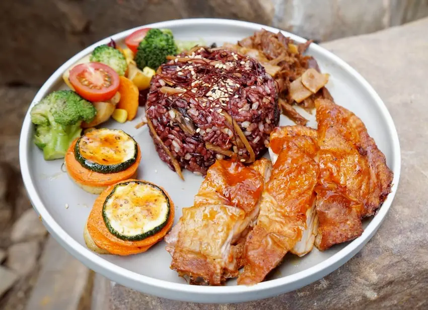 坐定位後,餐點一上桌真的讓人眼睛一亮!整體擺盤走的是清爽又有質感的風格,一盤裡就能同時吃到多種豐富食材。主食是帶點嚼勁的紫米飯,拌入些許配料與芝麻,越吃越香;配菜部分也很用心,像是花椰菜、玉米筍、紅蘿蔔與小番茄等,色彩繽紛又清爽,吃起來沒有負擔。另外還有烤得剛剛好的櫛瓜與馬鈴薯,口感軟嫩中帶點微微焦香,再加上滷製入味的小菜,整體搭配起來不只是好看,也很有飽足感。
