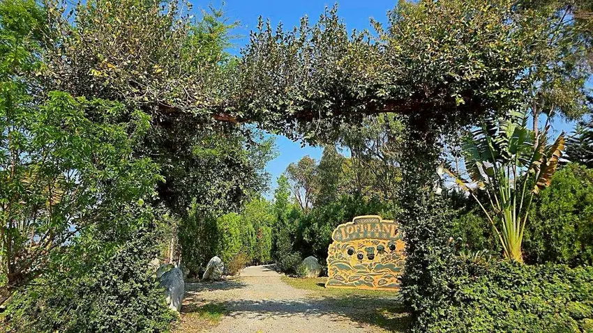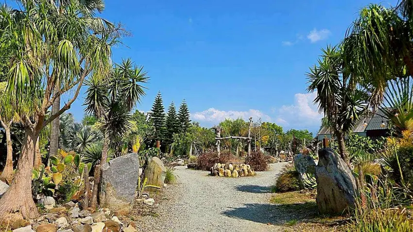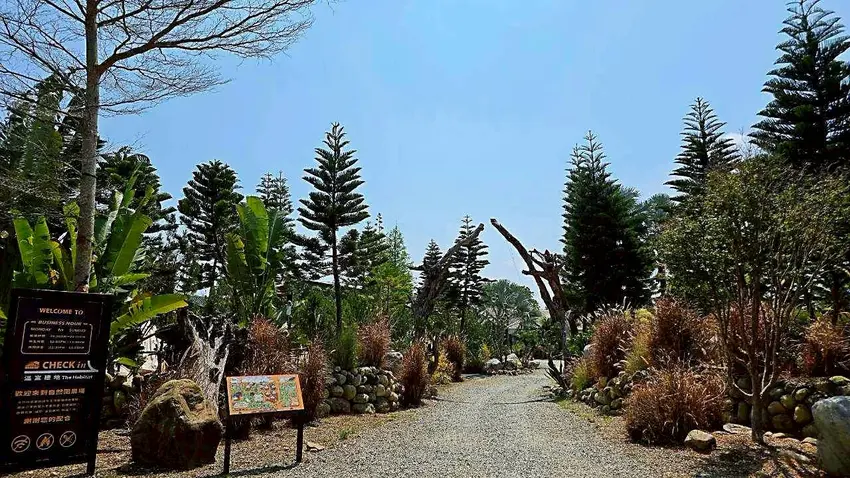 走進園區後,映入眼簾的是一條充滿自然感的小徑,兩旁種滿各式植物,有挺拔的樹木,也有帶點異國風情的植栽點綴其中。石頭堆疊出的景觀搭配些許枯木造景,讓整個空間多了一點原始又帶點設計感的氛圍。陽光從樹梢間灑落下來,灑在碎石步道上,光影交錯之間特別有感覺。一路往前走,不只是視覺上的享受,連空氣都變得清新起來,讓人不自覺放慢腳步,好好感受這片被綠意包圍的空間。