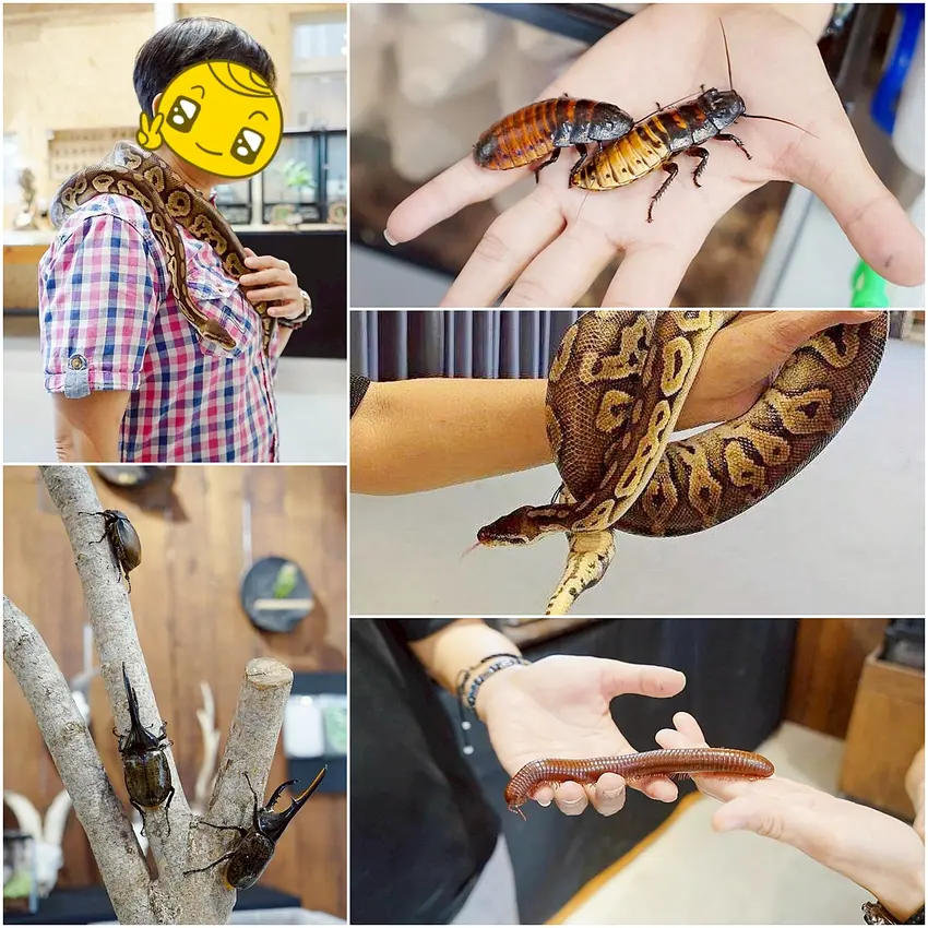 竟然還有平常比較少見的動物,像是可愛(?)的馬達加斯加蟑螂、球蟒、馬陸,還有各種甲蟲,真的讓人又驚又喜!其中最有趣的就是球蟒,朋友直接把牠當成圍巾掛在脖子上,她還一臉淡定地說觸感很滑順、而且冰冰涼涼的(笑),這時候才真的體會到什麼叫「冷血動物」XD