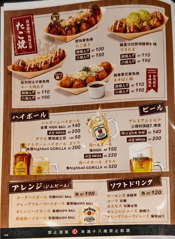 攤開菜單,餐點主要以各式口味的章魚燒為核心,並搭配日式炒麵與鐵板料理等下酒菜。最值得稱讚的是,店家比照日本當地的點餐模式,提供了「4 入」的選項。對於只想微解嘴饞、單人用餐,或是想同時品嚐多種口味的顧客而言,這樣的份量設計極度友善。在價格方面,原味章魚燒 8 入約為 180 元,4 入則落在 100 至 110 元之間;起司明太子等特殊口味的 4 入價格約為 110 元,讓顧客能以合理的預算,輕鬆體驗正宗的日本風味。