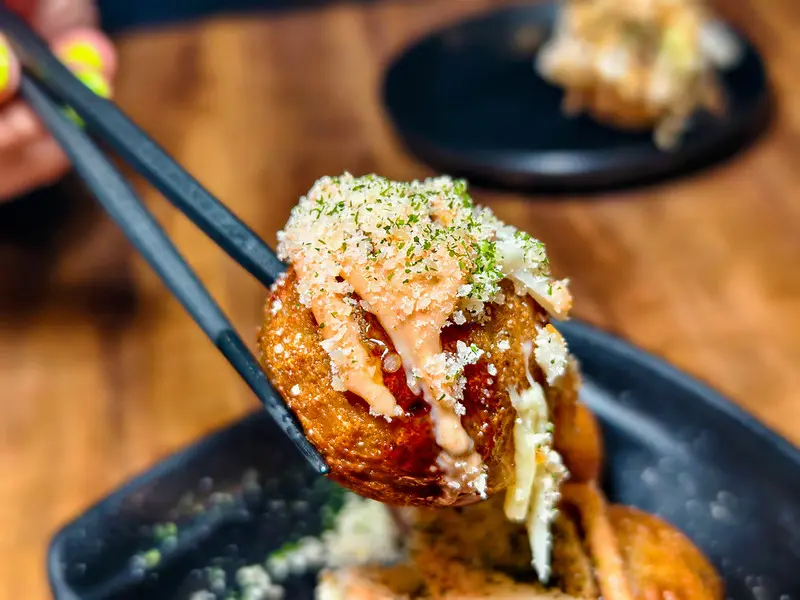 喜愛濃郁風味的饕客,極度推薦「起司明太子章魚燒」。表層鋪滿了特調的明太子美乃滋與微微牽絲的融化起司,明太子的微辛鹹香與起司的醇厚奶味完美交融。搭配著軟糊燙口的章魚燒本體,濃郁的滋味在口中化開。這種極具份量感的重口味組合,最適合搭配一杯冰涼清爽的啤酒或是招牌角嗨,在碳水化合物與微醺酒精的交織下,帶來最純粹的療癒感。