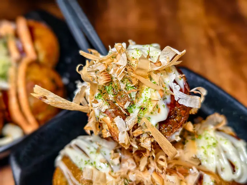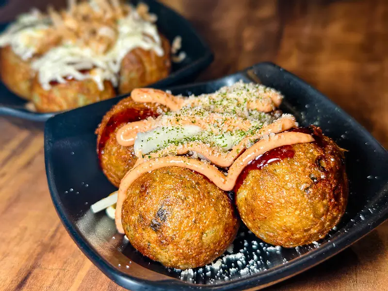 招牌的「原味章魚燒」上桌時,表層的柴魚片還隨著熱氣微微跳動。一口咬下,能明顯感受到與台式章魚燒截然不同的日式標準口感。內餡呈現半熟爆漿的軟糯狀態,散發出濃郁的高湯鮮甜,包裹著給料大方、咀嚼感十足的 Q 彈章魚塊。若極度偏好台式那種卡滋卡滋的酥脆外皮,菜單上甚至幽默地提供了「炸花枝丸」的選項,巧妙滿足了不同顧客的飲食習慣。