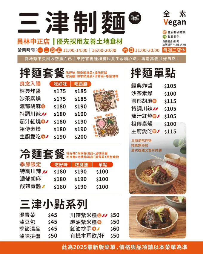 彰化縣員林市的「釀善三津制麵」,傳承三代的製麵工藝搭配無過度加工的天然食材,以一碗純粹溫潤的胡麻拌麵,成為在地極具口碑的高質感蔬食名單。