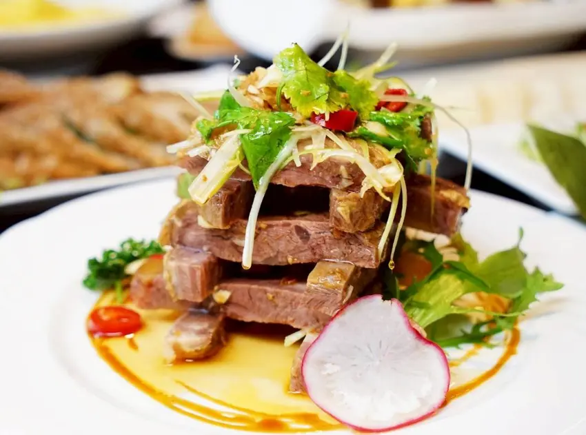 這道涼菜「川辣牛腱子」,一上桌就很吸睛,牛腱肉以層層堆疊的方式呈現,視覺感十足。