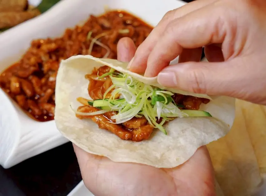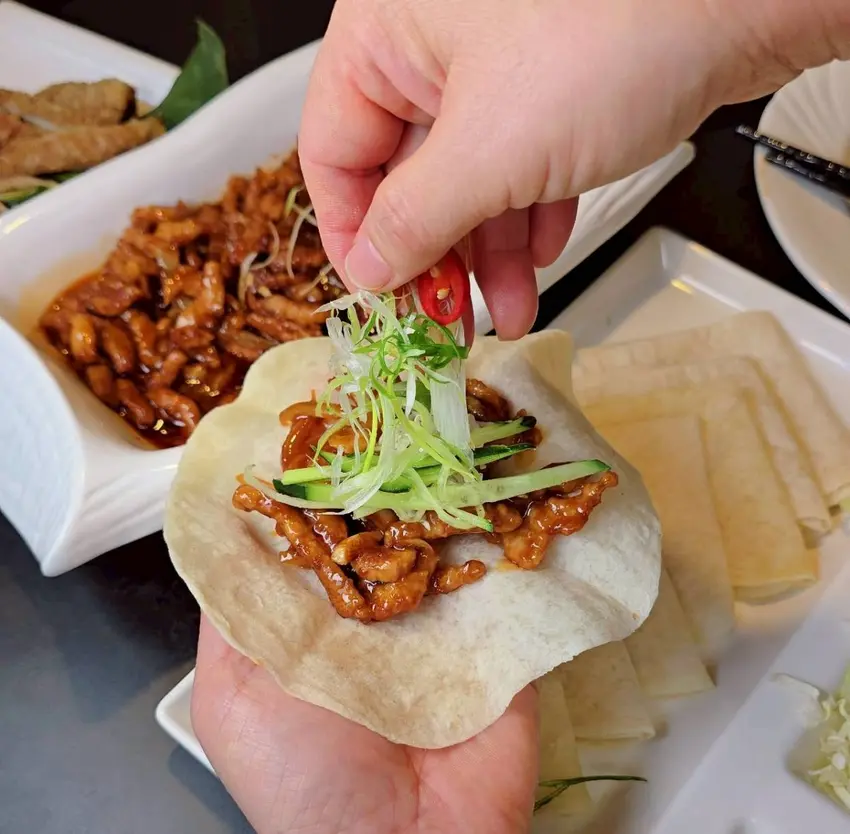 吃的時候,小涼喜歡把餅皮攤開在手上,先夾入一大口京醬肉絲,再依照自己的喜好加入小黃瓜與蔥絲,最後輕輕包起來,一口咬下,餅皮的柔軟、肉絲的鹹香與配菜的清脆在口中層層堆疊,真的會讓人一捲接一捲停不下來,越吃越涮嘴!