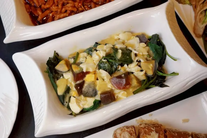 金銀地瓜葉是一道很特別的菜,將地瓜葉、皮蛋以及鹹蛋的鹹香巧妙融合,吃起來有種濃郁又不膩的味道。皮蛋的滑潤和鹹蛋的香氣讓整道菜多了層次,但又不搶地瓜葉的清爽口感,輕輕拌一拌就能吃到蛋香和青菜的完美平衡,簡單又好吃。
