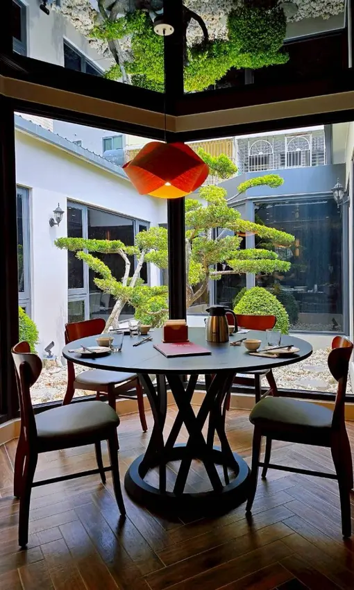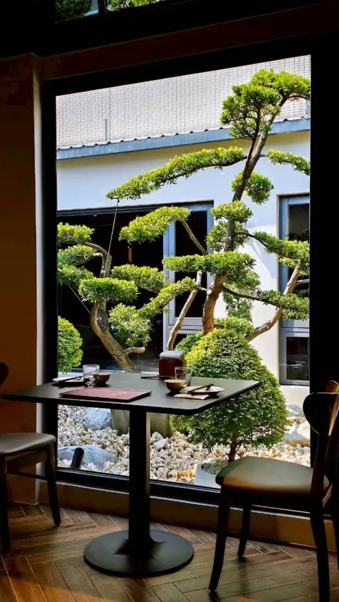 這區用餐空間真的讓人一走進來就放鬆下來~大片落地窗把自然光整個引進室內,窗外是精心整理的庭園造景,綠意盎然的植栽搭配碎石,有種在城市裡偷偷擁有一座小庭院的感覺。
