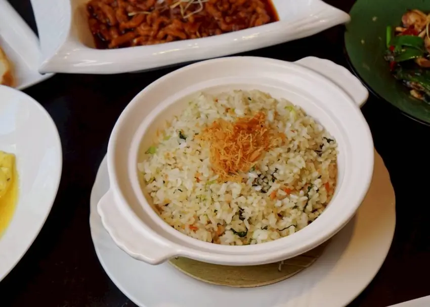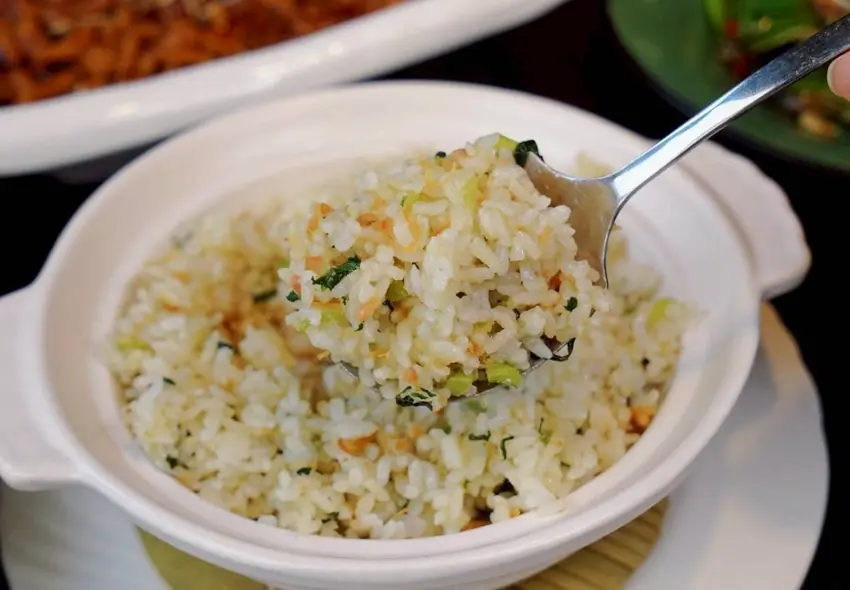 香Q米飯拌入清脆的青江菜和香氣十足的家鄉肉(火腿),上面還撒了些干貝絲,每一口都充滿鮮香。記得吃之前先拌均勻,這樣香氣更明顯,米飯也更入味。