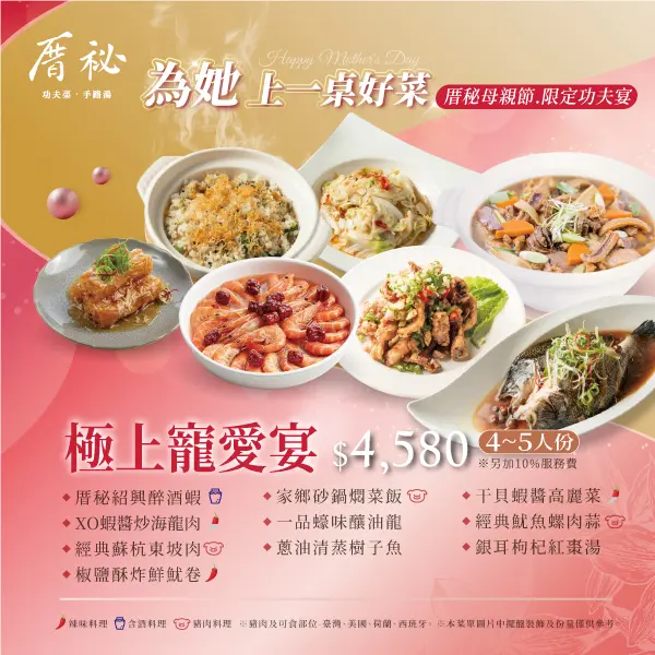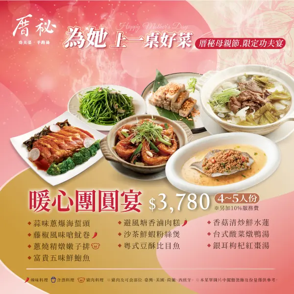 因應現在大家都是小家庭,厝秘特別在母親節期間5/1~5/10日推出了4~5人份的限定功夫宴,記得先訂位喔!5/9~5/10日僅提供母親節套餐及桌菜。