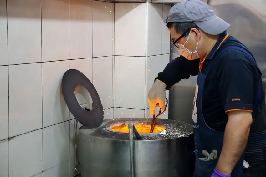 阿國碳烤燒餅的靈魂在於其費工的製作過程。店家嚴選當日老麵作為酵母,混合新麵進行低溫發酵,賦予麵皮極佳的 Q 彈口感。店門口的騎樓下總能看見新鮮晾著的三星蔥,相較於一般青蔥,其香氣更為濃厚且多汁清甜。最吸睛的莫過於專門烤製三角餅的特製碳烤爐,老闆親自至鶯歌挑選高品質粗胚,結合不鏽鋼桶打造而成。師傅憑藉深厚的火候功力,將揉好的麵餅貼於爐壁,精準掌控底層炭火溫度,烤出金黃酥脆且膨脹誘人的絕佳外觀。