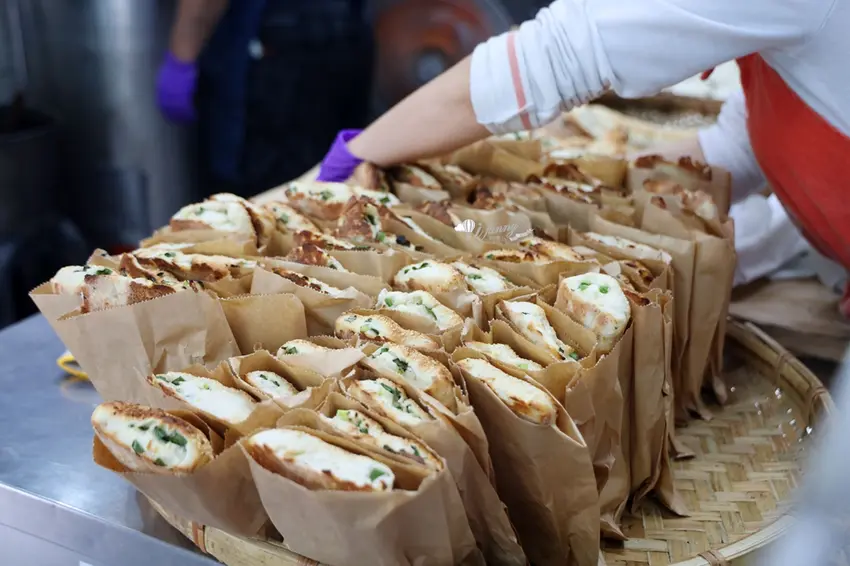 定價 35 元的「三角餅」是來店必搶的招牌品項(五辛素)。為了方便顧客自行夾入煎蛋或油條,外觀特別改良成長方形。經過炭火高溫烘烤,麵皮表面附著了一股淡淡的迷人炭香。一口咬下,外皮酥脆而內裡軟 Q,包裹著滿滿的三星蔥餡,清爽多汁的蔥甜大幅提升了味覺的豐富度。即使放涼後品嚐,麵皮依然保有極佳的嚼勁,是極具水準的傳統麵食。若欲於當日現場自取,務必於早上 9 點前來電預訂以免向隅。