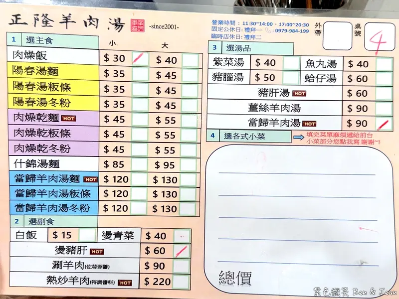 正隆羊肉湯菜單價位