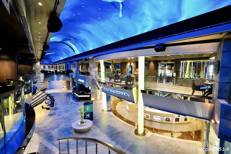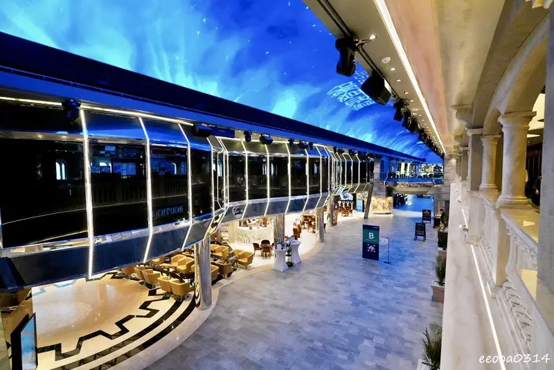 這裡彷彿是整艘船的心臟!透過1,450塊LED屏幕與1.4億個LED燈泡交織,走在長廊上,天花板會隨時間變換畫面。