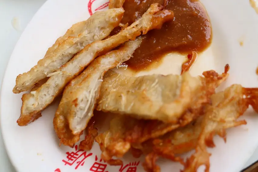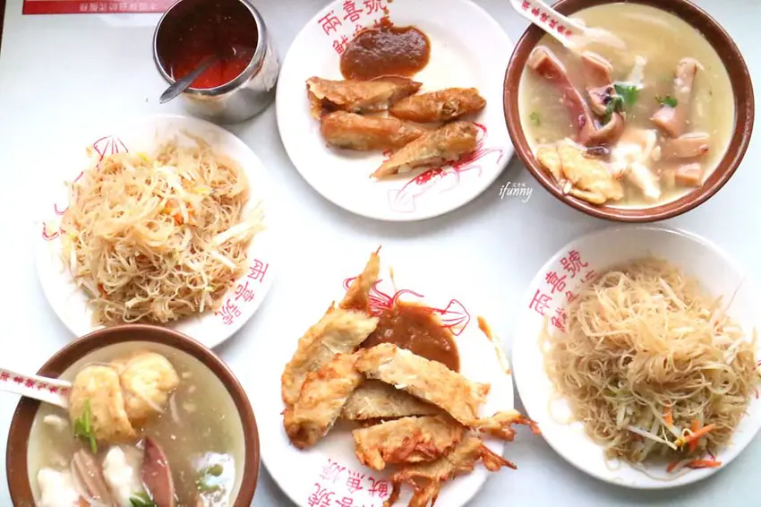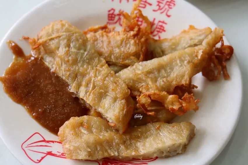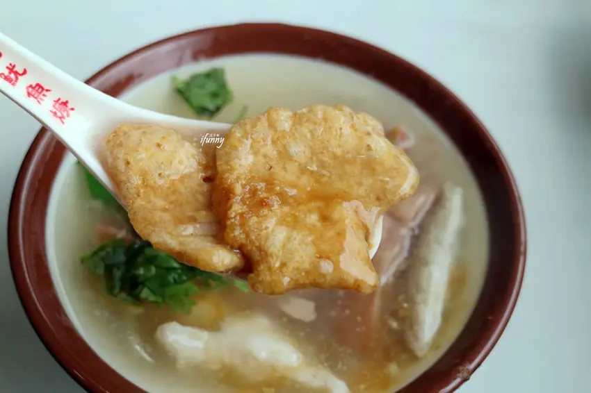 這裡的招牌魷魚焿展現了職人對食材的極致堅持,乾魷魚需經過浸泡 1 天、汆燙及冰鎮等繁瑣工序,才能成就出 Q 彈有勁且毫無腥味的絕佳口感。兩喜號最獨特之處在於將魷魚與魚漿分開處理,而非包裹在一起,這讓每一口都能嚐到食材本味。內行人必點的綜合焿湯包含了紮實魚漿、脆甜花枝漿、整隻入料的鮮甜蝦仁漿,以及完全沒有油耗味的香脆魚酥。湯頭以地瓜粉勾薄芡,並用蘿蔔絲煮出基底清甜,佐以濃厚蒜味與香菜點綴,這碗滋味清甜不膩口的焿湯,正是讓老饕們吃不膩的關鍵。