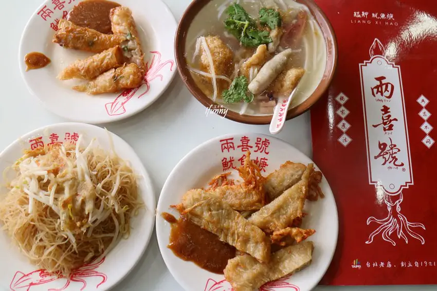 「兩喜號魷魚焿」創立於 1921 年、傳承 4 代的百年老店,就在捷運龍山寺站附近。憑藉著 Q 彈魷魚與經典炒米粉,早已成為萬華人心中無可取代的傳統標竿。