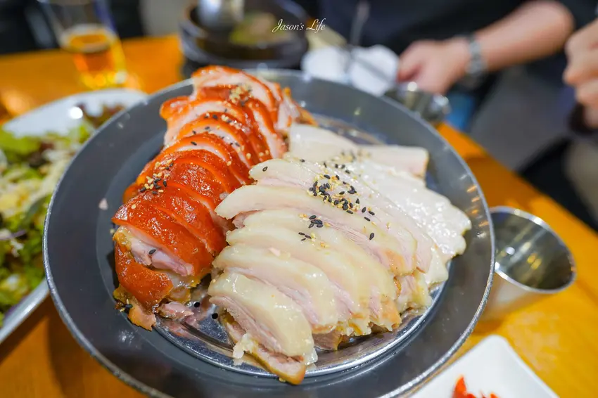 這裡的點餐靈魂絕對是「族譜套餐」,大份份量充足,約適合 2 至 3 人共食,內容包含皮 Q 肉嫩、醬汁鹹甜入味的招牌豬腳,外皮充滿彈性且肉質鬆軟不乾柴。最關鍵的特色在於隨餐附贈的超大盤沙拉,酸酸甜甜的醬汁搭配蒜片一起包著肉享用,口感極度清爽且完全不膩口,這是韓式豬腳最頂級的享用方式。此外,每桌都會大方招待韓式泡菜鍋及刀削麵,搭配上多種免費續加的小菜,豐富的組合讓整餐的視覺與味覺層次感瞬間拉滿,每一口都能感受到老店對食材配比的堅持。
