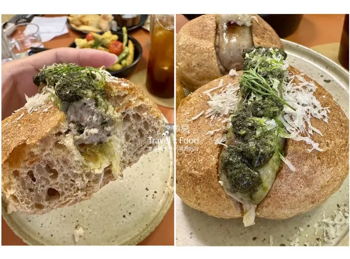 名為 HOTDOG,其實外觀比較像我們平常所見的香腸,堅持不使用防腐劑及亞硝酸鹽,100%手工自製,透過舒肥工法保留住肉汁的鮮甜與口感,搭配無奶油添加並以全麥粉製作的麥香麵包,簡單的風味襯托出香腸的獨特性,像這款熱內亞熱狗堡,使用義大利的熱內亞青醬,搭配多汁的手工羅勒香腸,不是單一的鹹味,而是羅勒香。