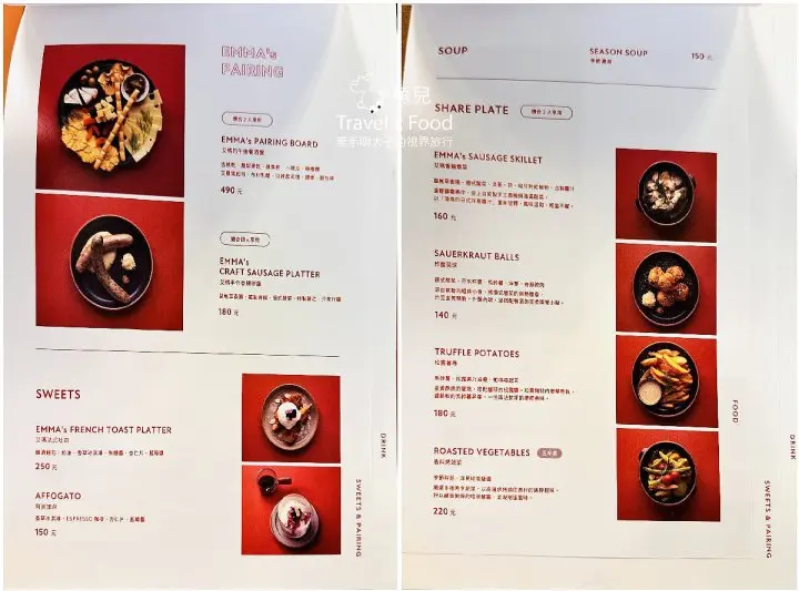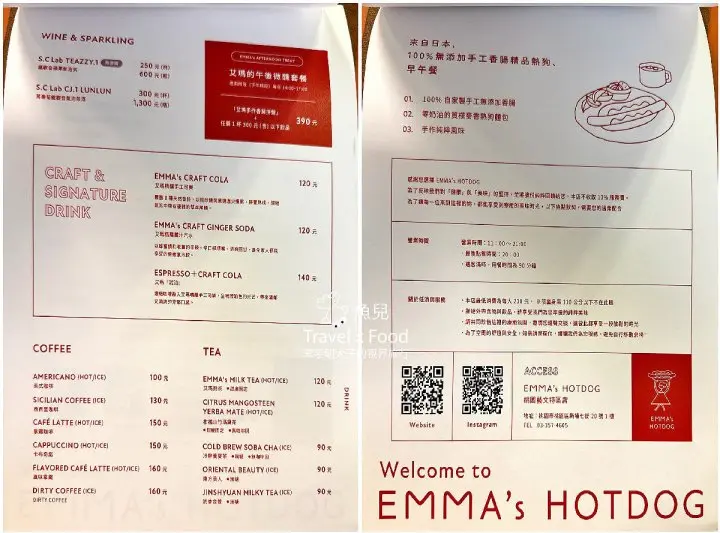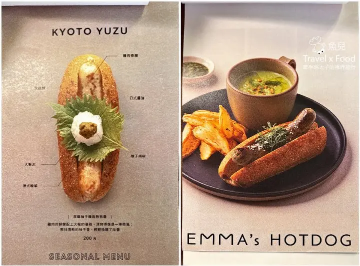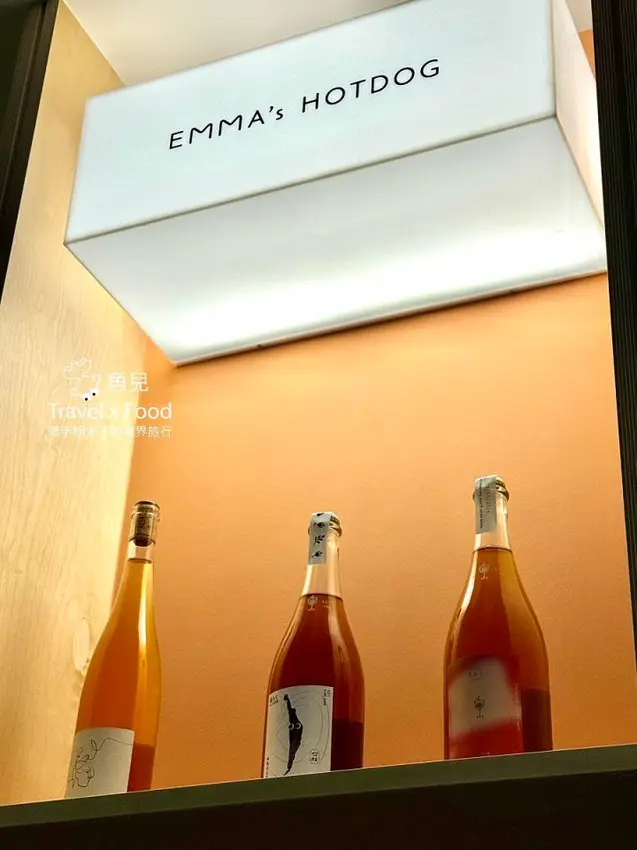 這兒的日與夜有著不同的氛圍感,除了熱狗堡,也供應早午餐盤及甜點,以及來自雙溪的鐵觀音變化而成的茶酒與氣泡飲,巧妙的讓台灣茶融入EMMA的餐桌。EMMA以她曾經造訪過的城市為每一道熱狗堡命名,也將繼續環遊世界收藏風味。