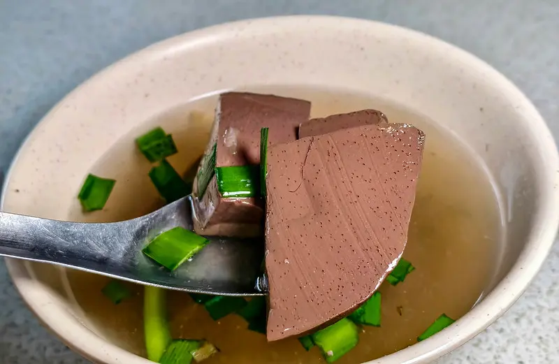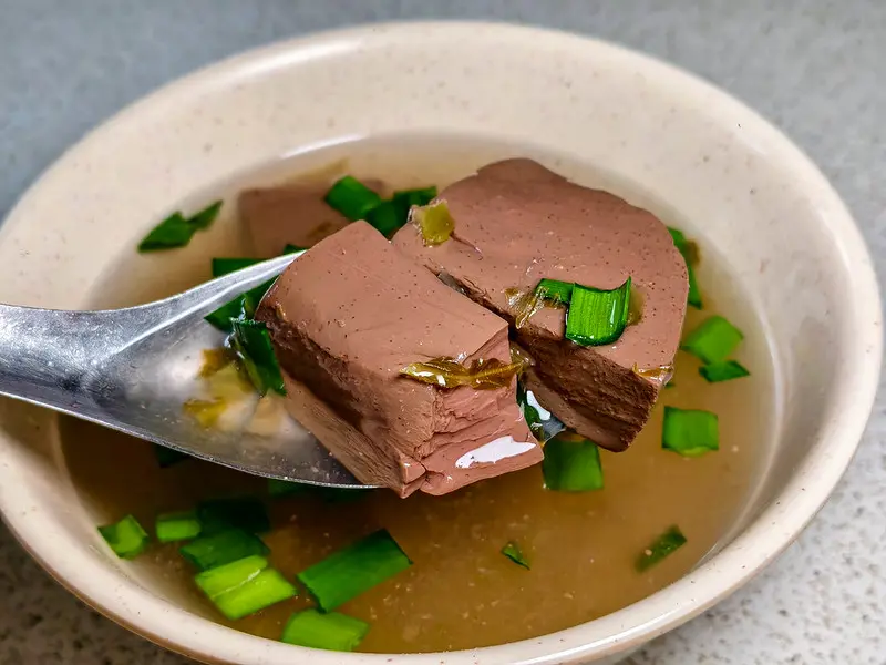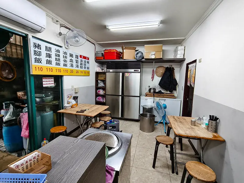 店內的豬血湯是不少人推薦的必點項目。大骨湯底清甜不燥,豬血切得大塊方正且口感脆口,完全沒有明顯腥味。湯頭裡撒了大量韭菜與沙茶提味,是極其標準且典型的台式配置。在吃完帶有油脂感的腿庫飯後,喝上幾口熱騰騰的湯頭,恰好發揮了清口與解膩的功能。這種不多不少、剛剛好的組合,雖然無法帶來驚喜的味覺震撼,卻能提供符合價格的踏實感。這種不花俏的飲食樣貌,正是尋常巷陌裡最真實的日常溫度。