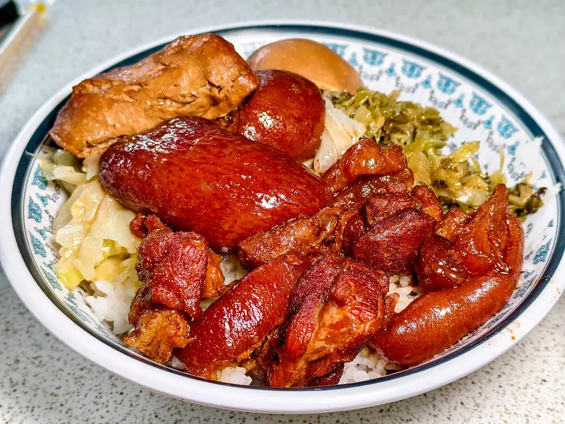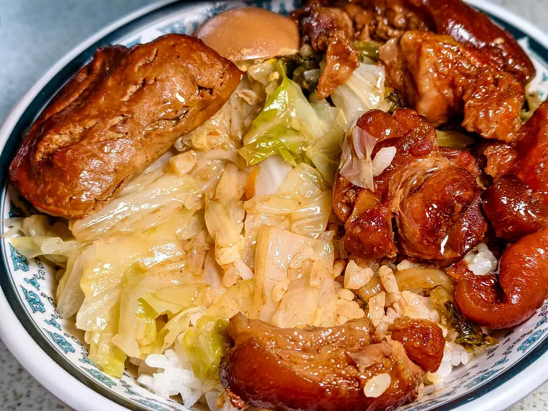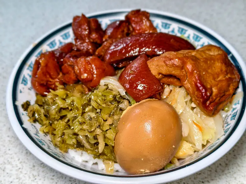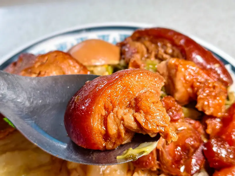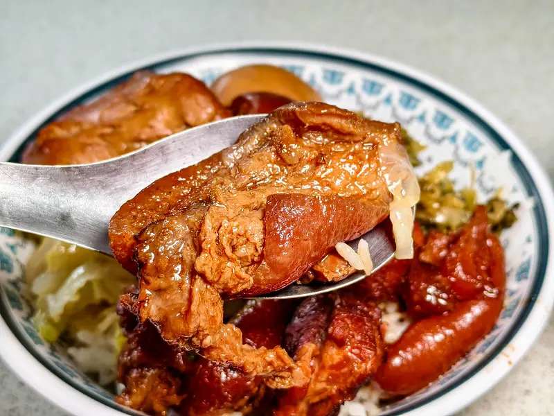 招牌腿庫飯端上桌,視覺感相當紮實。腿庫皮帶有深沉的琥珀醬色,將醬香精準滷進肉質層次裡。肥肉部分保留了迷人的 Q 度,而瘦肉吃起來則表現平穩,完全不會有乾柴的困擾。碗裡除了厚實的肉塊,還配有滷豆干、滷蛋與一勺酸菜,底下的白飯配上當季的高麗菜,整體口味偏向大眾化且鹹淡適中。雖然沒有那種需要時間沉澱的老滷深邃感,但拌著醬汁扒幾口飯填飽肚子,對於一份日常便飯來說,已經是非常及格的選擇。
