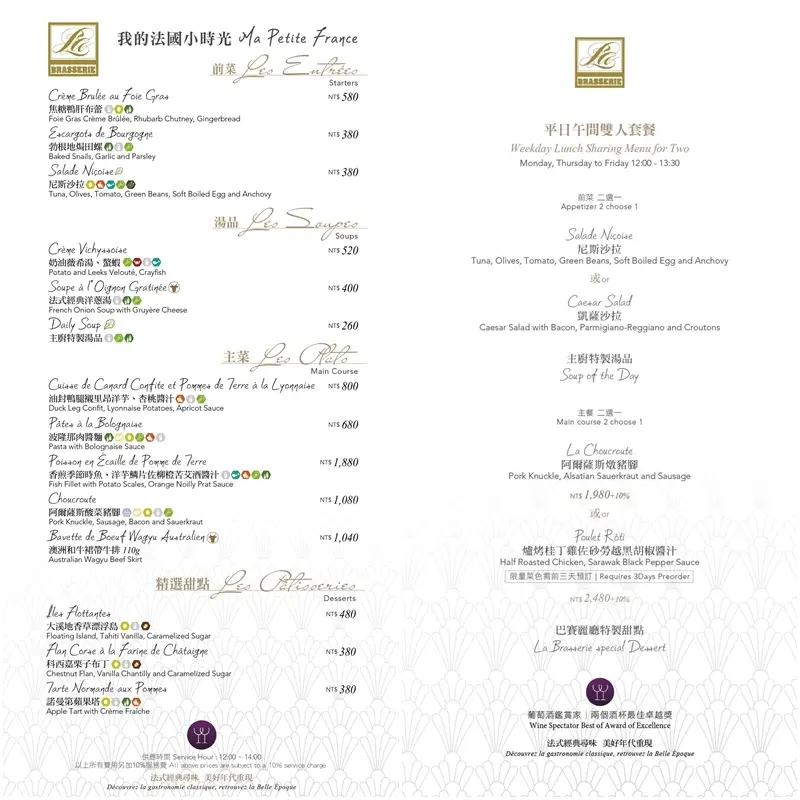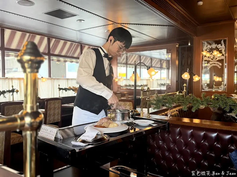 -中午餐期12:00-13:30 : 美好年代經典菜單-前菜、湯品、主菜、牛排、甜點