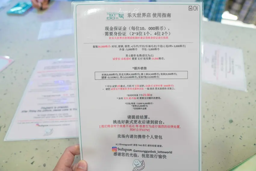針對熱門時段與例假日,強烈建議提前透過官方管道進行預約,以避免現場久候或位子客滿。辦理入場時需出示護照或身分證件,並現場填寫基本資料與繳交押金。目前租借 1 整套校服的費用為 20000 韓元,每人另需支付 10000 韓元的押金。歸還截止時間為當天 21:30 前,提供充裕的時間讓人在樂園內盡情遊玩與拍攝,整體流程對於觀光客而言相當友善且透明。