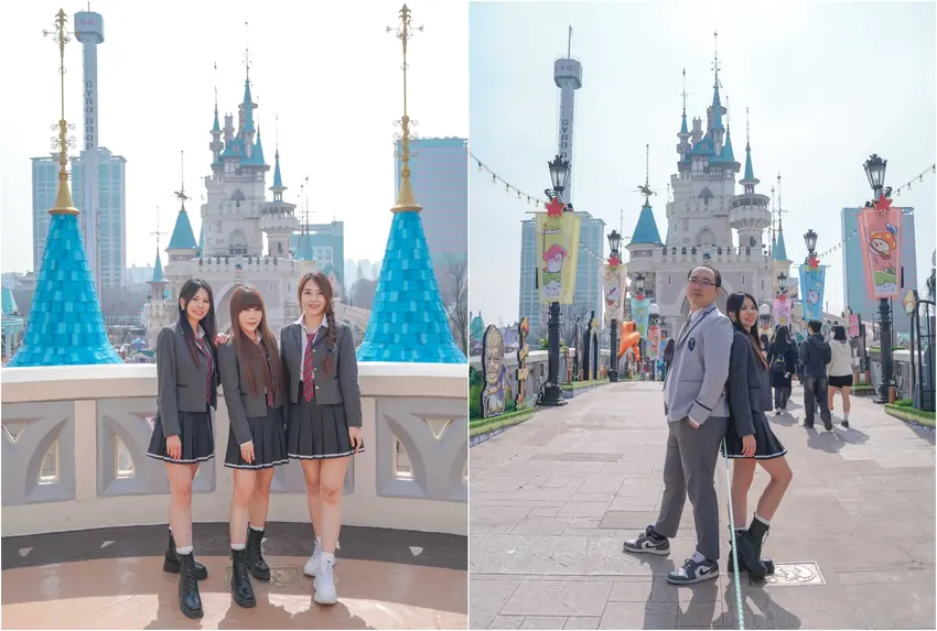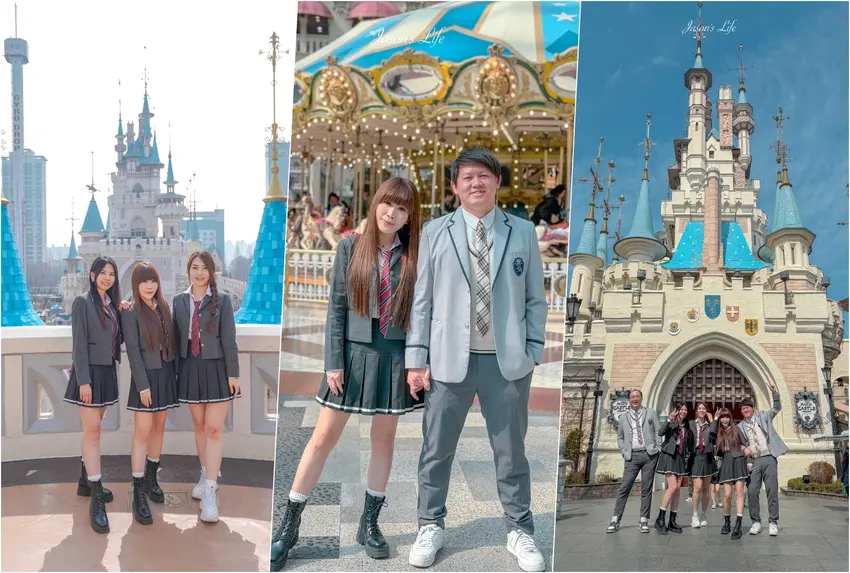 穿上韓劇常見的韓式校服,走進樂天世界拍照,是許多人造訪首爾的清單項目。感性校服樂天世界店位在樂天世界旁,提供多元款式與透明價格。