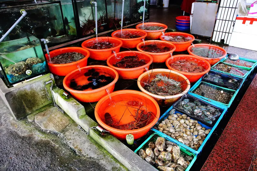 魚市攤位眾多,以販售現撈活海鮮為主,如萬里蟹、大鮑魚、軟絲等