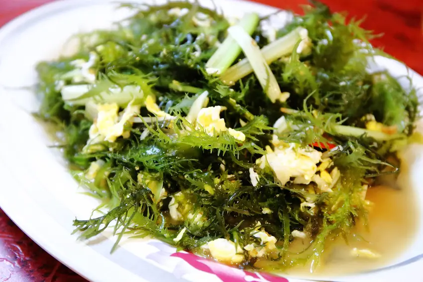 海菜帶有天然的膠質,口感脆嫩且吸附了蛋汁的香氣,與蓬鬆的雞蛋完美融合