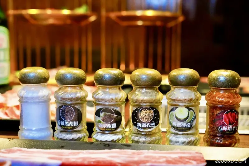 桌邊則備有各式特色調味粉:像是古代岩鹽、芥末椒鹽、椒鹽檸檬、香辣胡椒鹽,甚至是新疆孜然及八味唐辛子等。