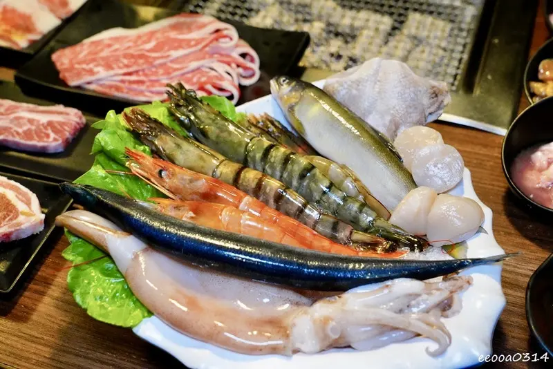 像是極鮮軟絲、生食級干貝、天使紅鑽蝦、巨鮮藍鑽蝦、泰國蝦、大白蝦,還有香魚、生蠔、蛤蜊、秋刀魚、魚下巴等通通吃得到。