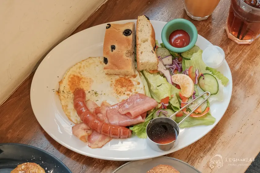 售價 209 元的美式早餐拼盤,將豐盛發揮到極致。義大利佛卡夏麵包帶有淡淡的橄欖油香氣,搭配雙份的半熟太陽蛋、德國香腸、火腿、培根與清爽的季節沙拉。鹹香與清新一次滿足,大份量的設計讓人吃得極具飽足感,甚至能直接當作早午晚餐享用。
