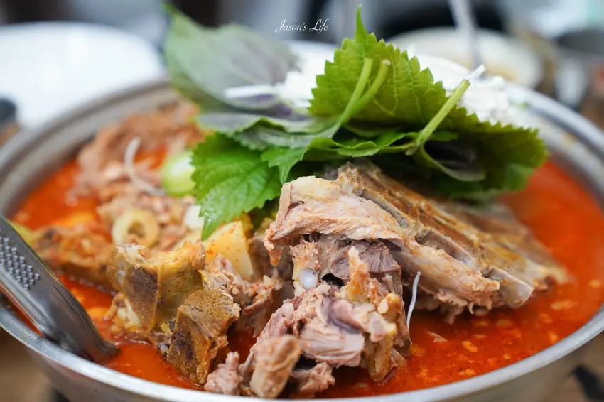 多人聚餐建議點選大份的馬鈴薯排骨湯,售價 49000 韓元。鍋內放入大量排骨、新鮮蘇子葉、馬鈴薯與金針菇。隨著湯頭滾動,蔬菜香氣融入濃郁肉湯中,味道隨時間推移變得更加濃厚。湯汁下飯且辣度溫和,排骨肉質熬煮至骨肉分離,輕輕一撥即可取下,肉量驚人且毫不乾柴,直接拿起來啃食最過癮。
