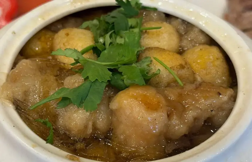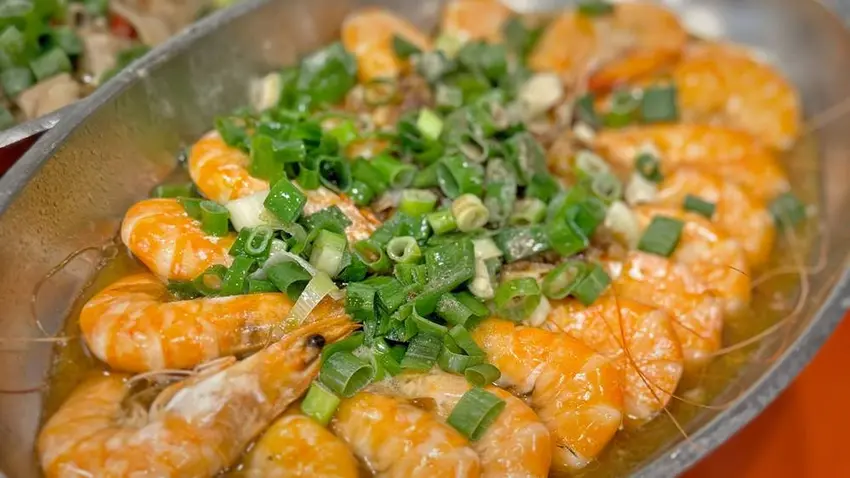湯品部分首推一品佛跳盅,湯頭熬煮得極為濃郁,內部用料扎實且澎湃,每一口都能品嚐到食材燉煮出的精華,讓人忍不住一碗接一碗。海鮮部分則有蒜泥蒸大蝦,濃郁的蒜香完美襯托出蝦肉的彈牙與鮮甜,是桌菜中極具份量的海鮮亮點。