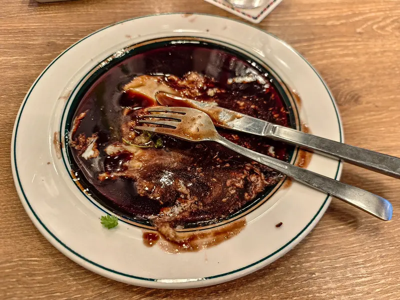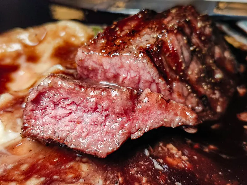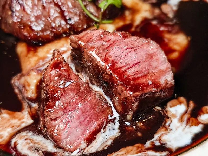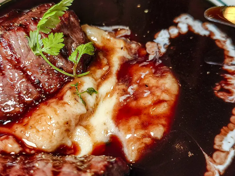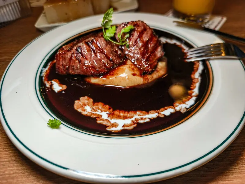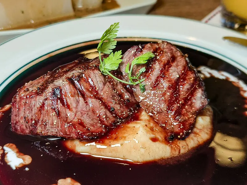 近江牛排並非單吃原味,而是必須搭配底層的肉汁醬一同享用。鹹度稍高的調味完美迎合了肉骨熬煮的甘甜,醬汁將近江牛原有的鮮甜脂香與鹹鮮滋味徹底融合。咀嚼間和牛油脂與厚實燉醬相互交織,給予只想單純吃肉的胃袋最直接的飽足感與撫慰。