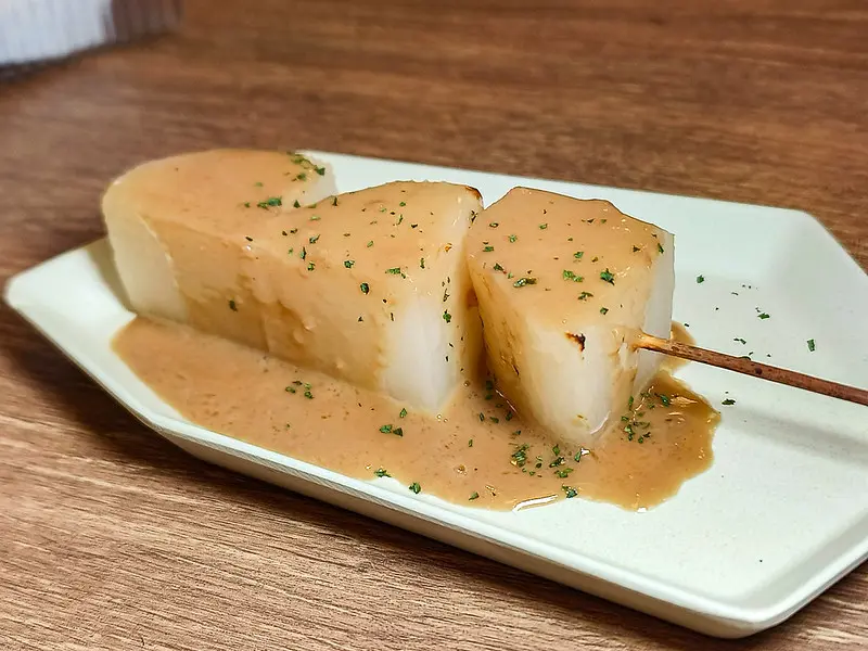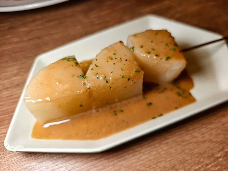 除了重口味肉食,售價 190 日圓的軟嫩白蘿蔔佐牛肝菌菇奶油醬更是必點的奇妙組合。骨子裡是日式關東煮燉得極透的白蘿蔔,咬下時滿是清甜水分;外層卻淋滿法式牛肝菌菇奶油醬,滑順口感中帶有濃郁木質香氣,完美呈現和洋折衷的飲食趣味。
