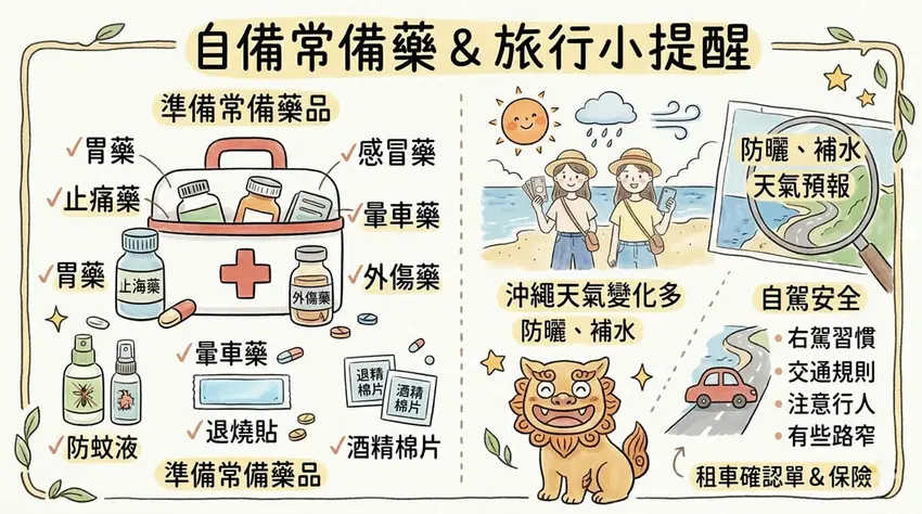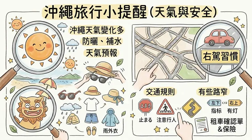 沖繩氣候變化快速,夏季前往需特別注意防曬與隨時補充水分。每年 5 至 10 月為颱風好發季節,出發前務必密切查看氣象預報並強烈建議投保旅遊不便險以防萬一。針對初次挑戰日本自駕的旅人,務必牢記右駕習慣與左小轉、右大轉的行車口訣,轉彎時絕對要確實停看聽並禮讓行人。租車時建議購買包含營業損失賠償的最高級別安心保險,讓整趟自駕旅程更加從容。