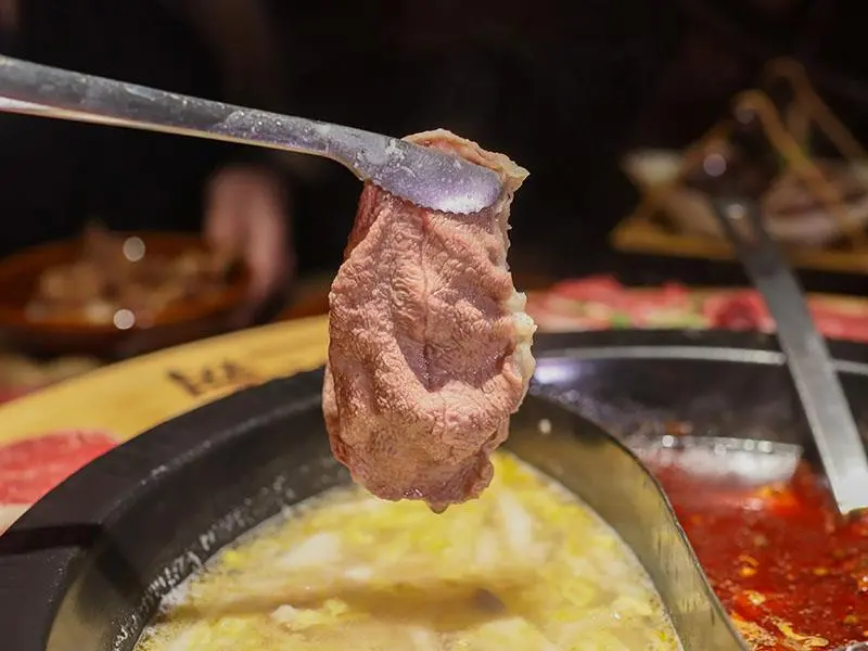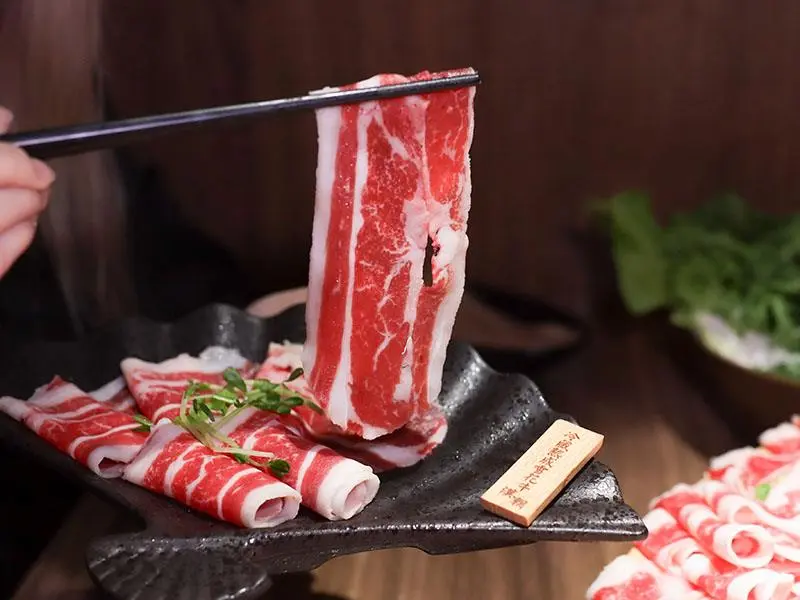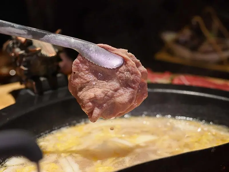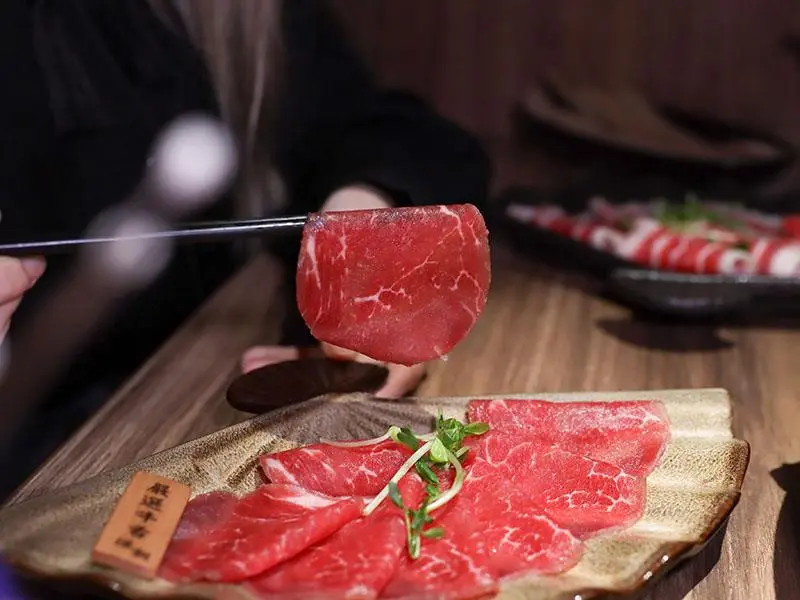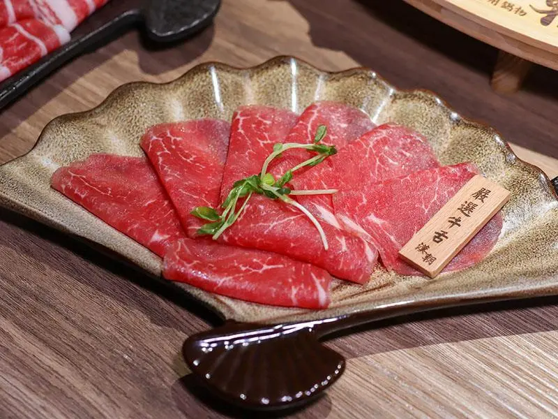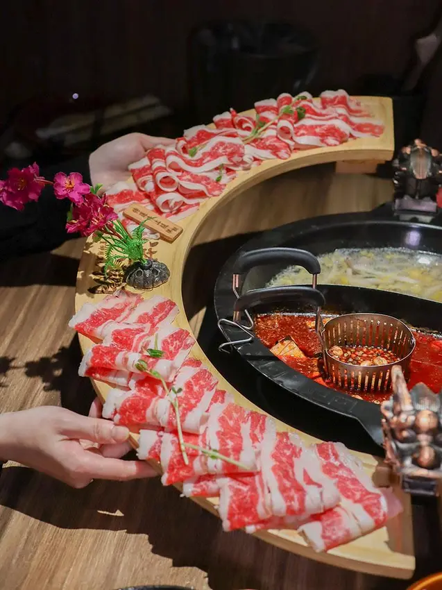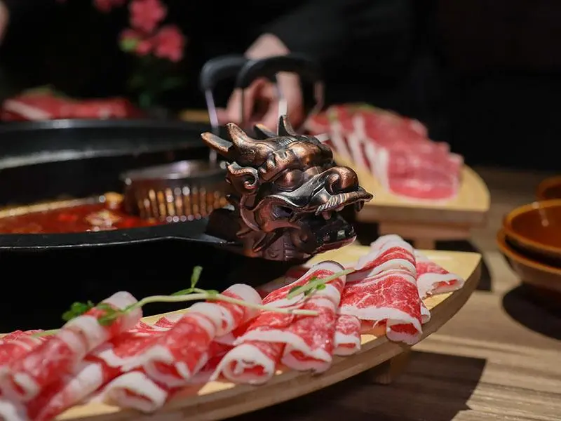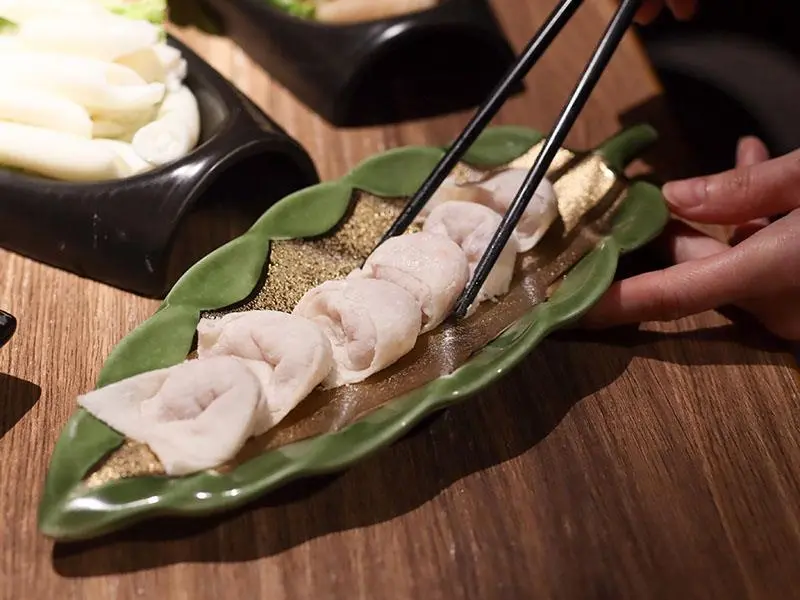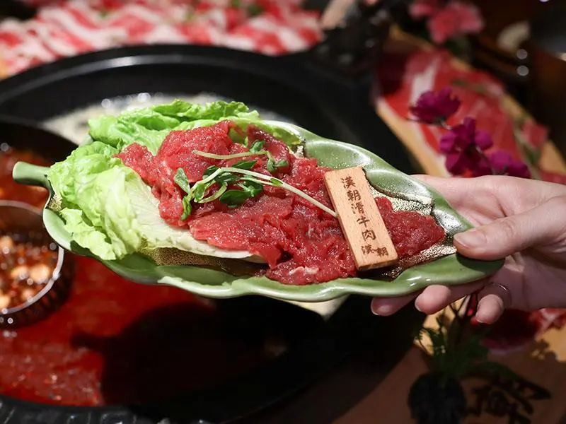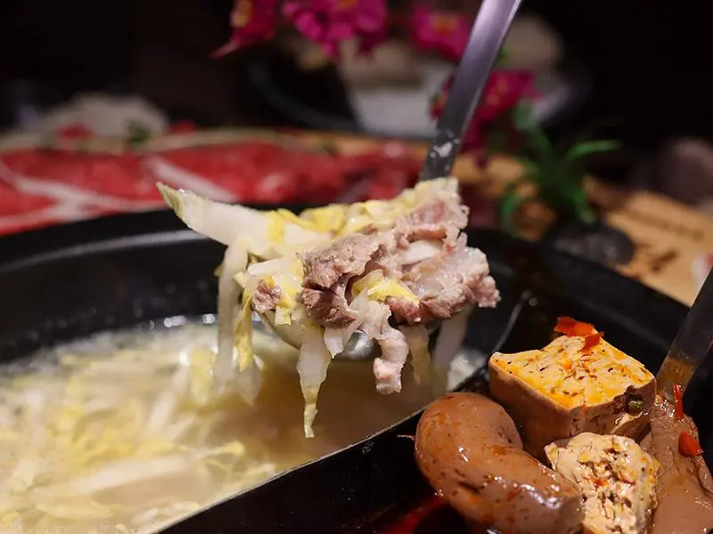 造型霸氣的龍頭鴛鴦鍋一上桌便能吸引眾人目光。湯底推薦麻辣鍋與酸菜白肉鍋的紅白雙拼組合。麻辣湯底香氣濃郁,花椒微麻感獨立區隔,辣而不燥且能免費續加湯底;酸菜白肉鍋則酸香十足,適合用來涮煮各式肉片,能大幅提升肉質鮮甜,兩者交替食用極具解膩效果。