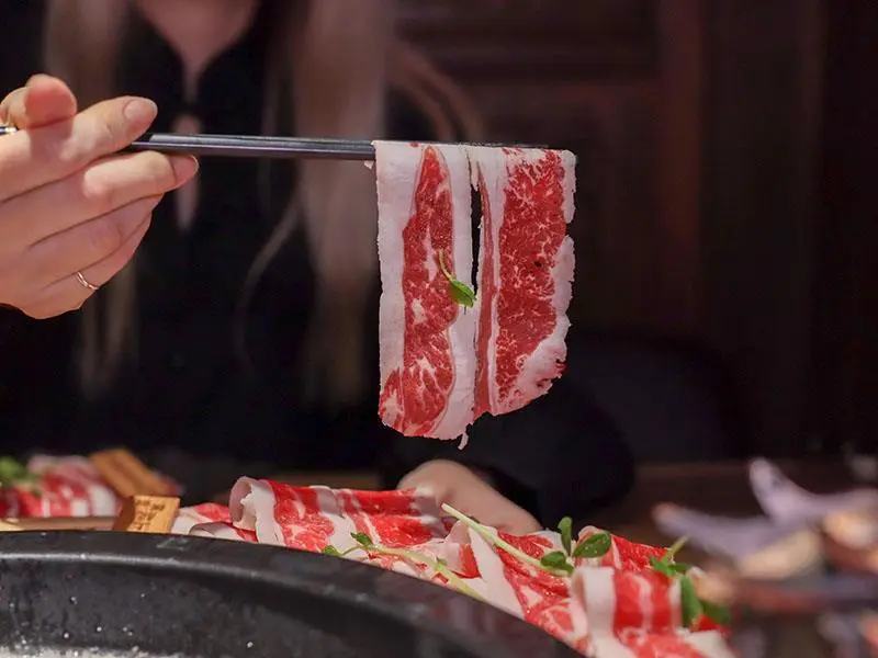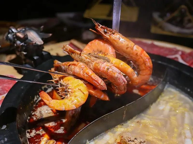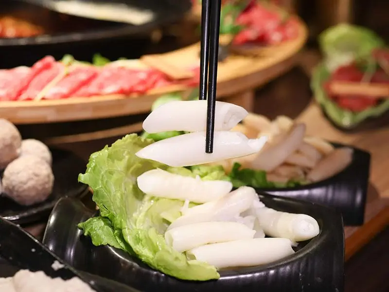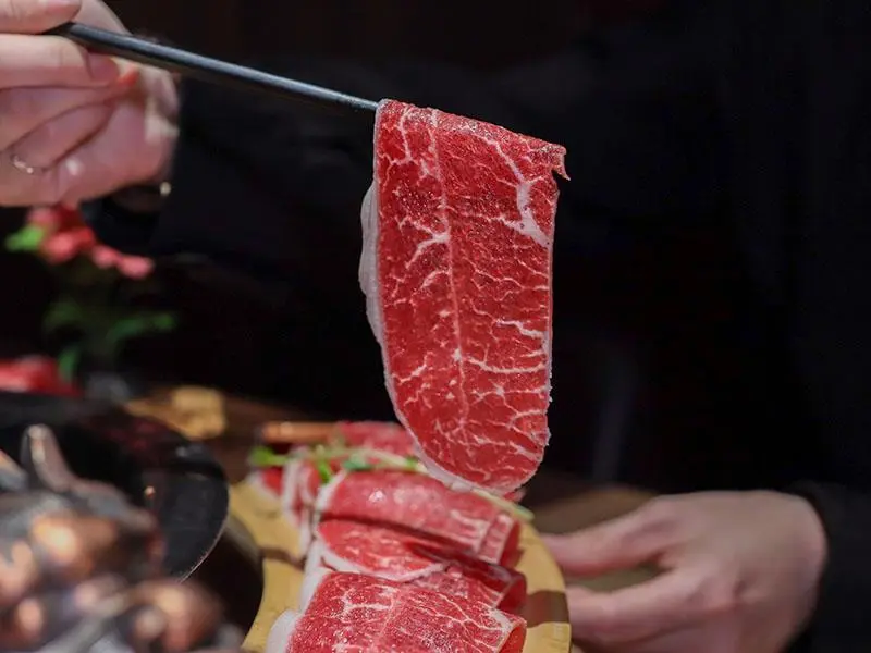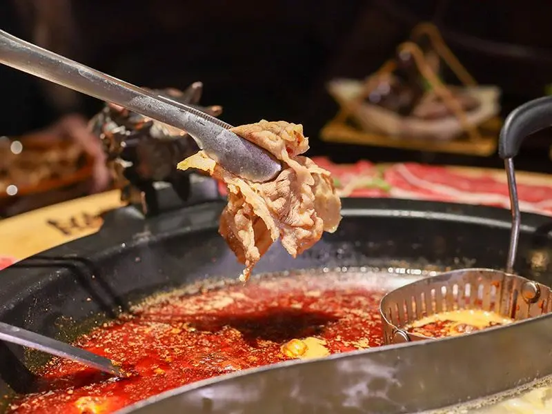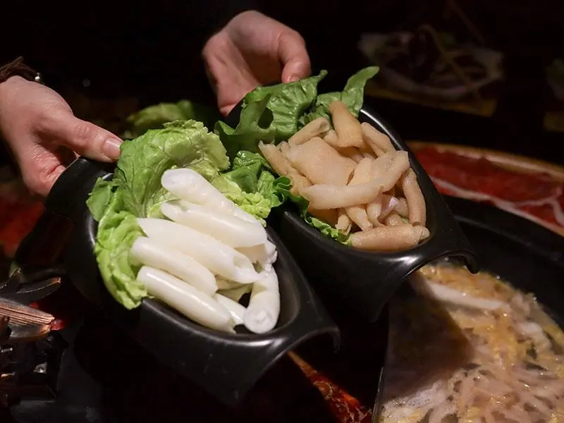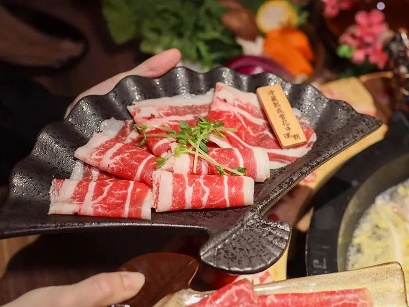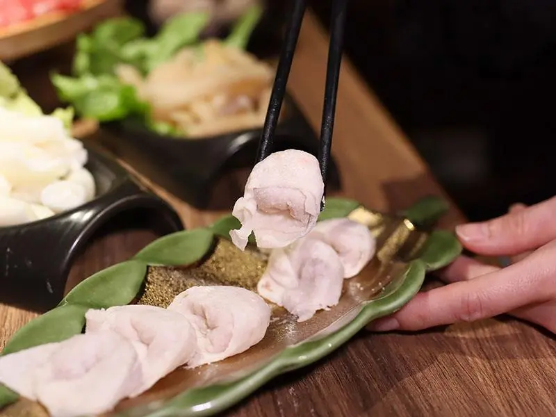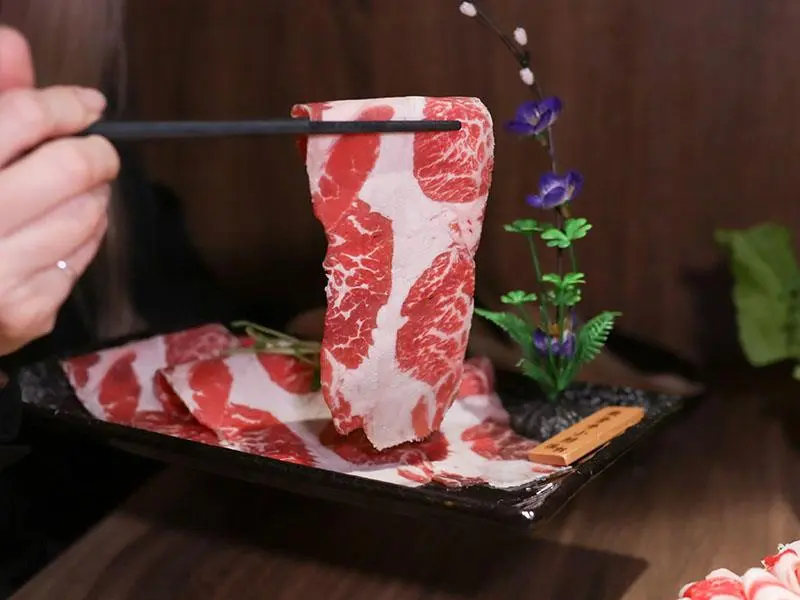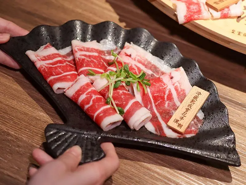 造型霸氣的龍頭鴛鴦鍋一上桌便能吸引眾人目光。湯底推薦麻辣鍋與酸菜白肉鍋的紅白雙拼組合。麻辣湯底香氣濃郁,花椒微麻感獨立區隔,辣而不燥且能免費續加湯底;酸菜白肉鍋則酸香十足,適合用來涮煮各式肉片,能大幅提升肉質鮮甜,兩者交替食用極具解膩效果。
